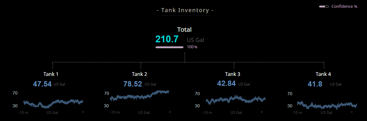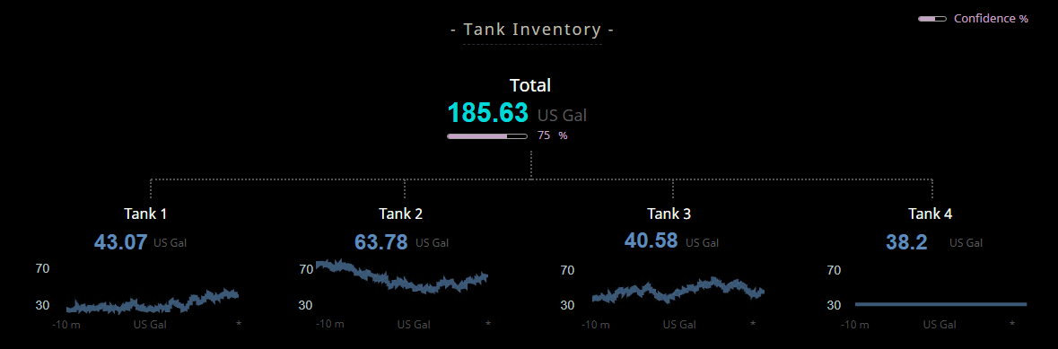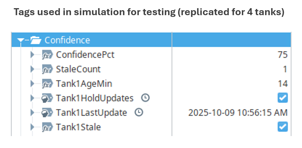 | Implementation Approach | Four simulated tanks generate random level values within a configurable range. Each tank includes a Hold Updates toggle that pauses data changes, allowing its Age (min) to increase. A decaying confidence function reduces reliability as the age approaches a configurable threshold (Conf_StaleAfterMin). |